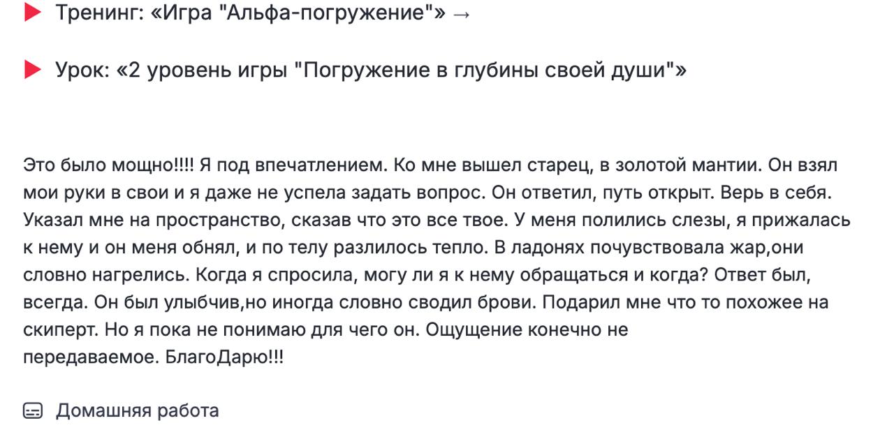 В скрине ниже девушка поделилась, что она увидела в практике на 2 уровне игры "Альфа Погружение".