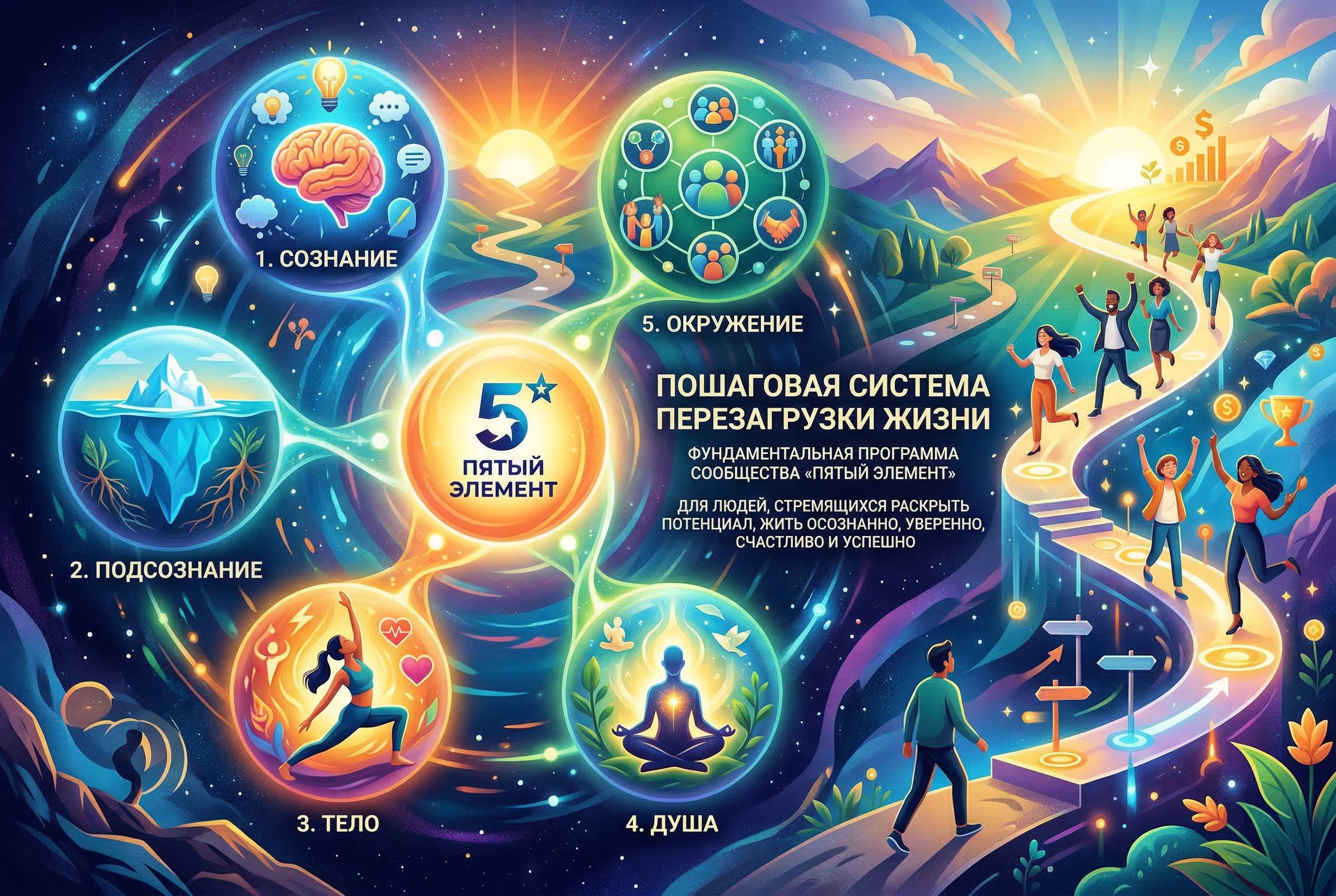Это фундаментальная, комплексная программа сообщества "Пятый элемент". Предназначена для людей, которые стремятся раскрыть свой потенциал и начать жить более осознанной, уверенной, счастливой и успешной жизнью. Данная программа работает со свсеми сферами жизни. Включает работу с 5 элементами: сознание, подсознание, тело, душа, окружение.
