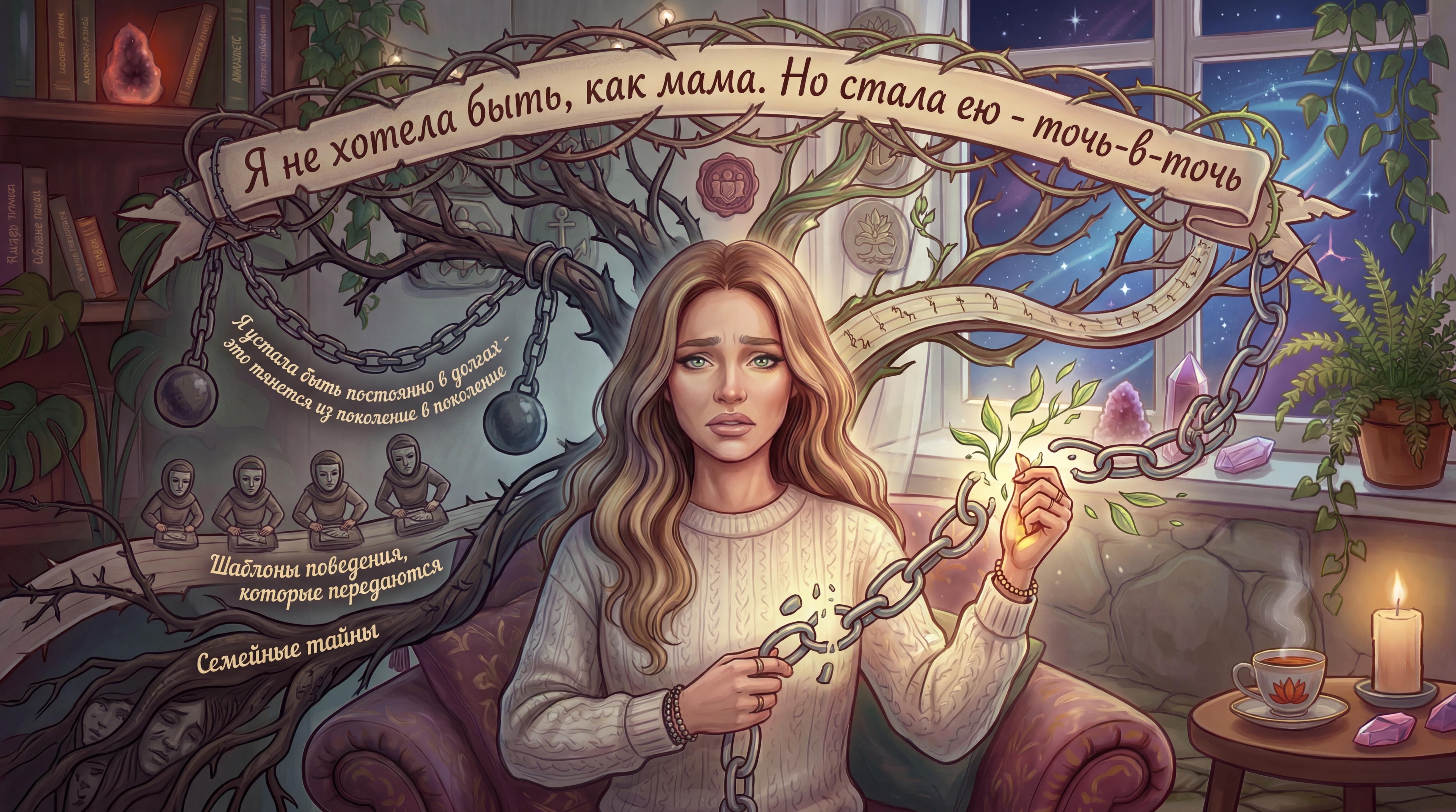 Каждый из нас - часть огромной семейной системы, связанной невидимыми нитями прошлого. Что, если именно эти нити определяют наши судьбы, отношения, финансы и здоровье? Внутри каждого рода заложены определённые сценарии - шаблоны поведения, убеждения и реакции, которые передаются из поколения в поколение. И если эти программы не осознаны и не проработаны, они действуют как невидимый тормоз, мешая вам жить полной жизнью и реализовывать свои мечты.